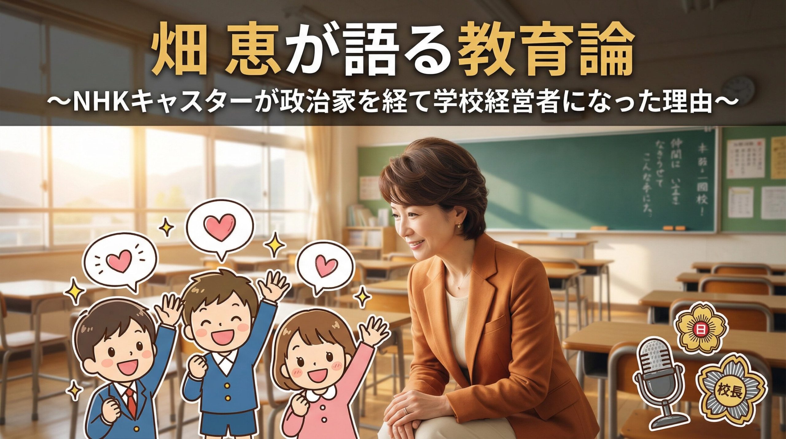 NHKの最年少キャスターから、フリーランスキャスター、参議院議員、そして学校法人の理事長へ。畑恵さんのキャリアは一見バラバラに見えて、「より良き未来のために、人を育て社会を変える」という一貫した志がその根底に流れています。